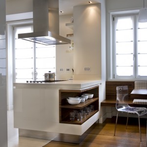 Palissandro, noce canaletto, piani cucina in corian, teak, rovere e superfici laccate