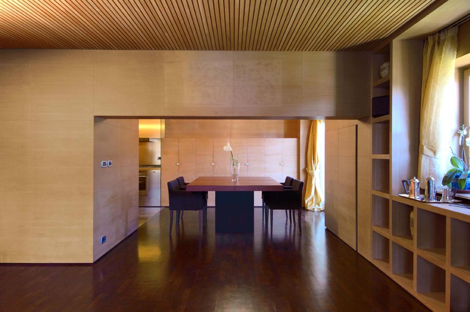 Materiali che avvolgono, proteggono e si compongono, per ricercare il calore senza rinunciare al vivere contemporaneo anche in montagna. A partire dai materiali della tradizione locale, linearità e funzionalità sono ottenute attraverso la capacità di abbinare il legno al cuoio, alle piastrelle in ceramica, al vetro, al corian e al rame.